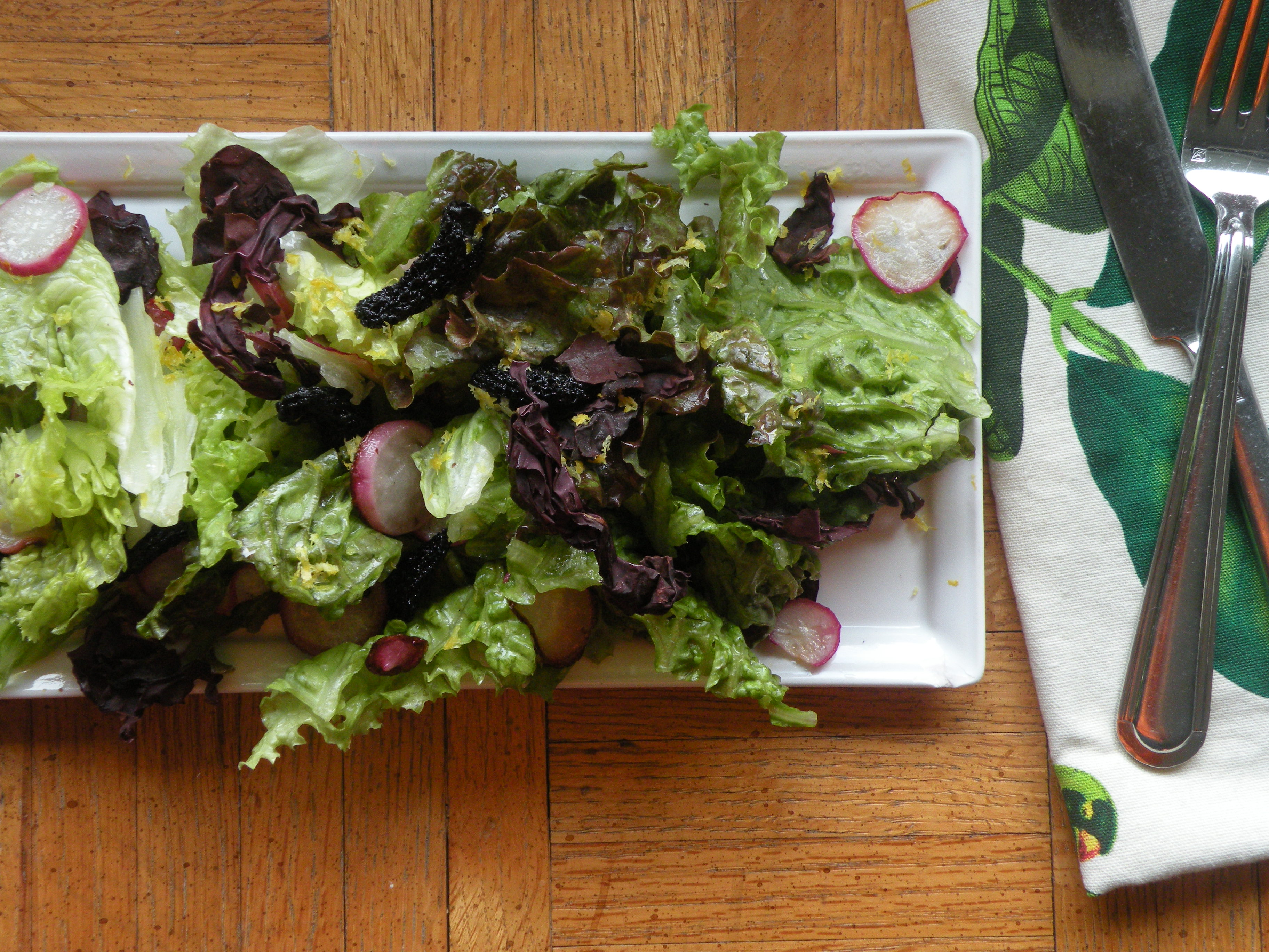 4. Remove the garlic from the dressing. Add lettuce, radishes, dulse and mushrooms to the bowl with the dressing and toss to coat. Adjust salt and pepper.