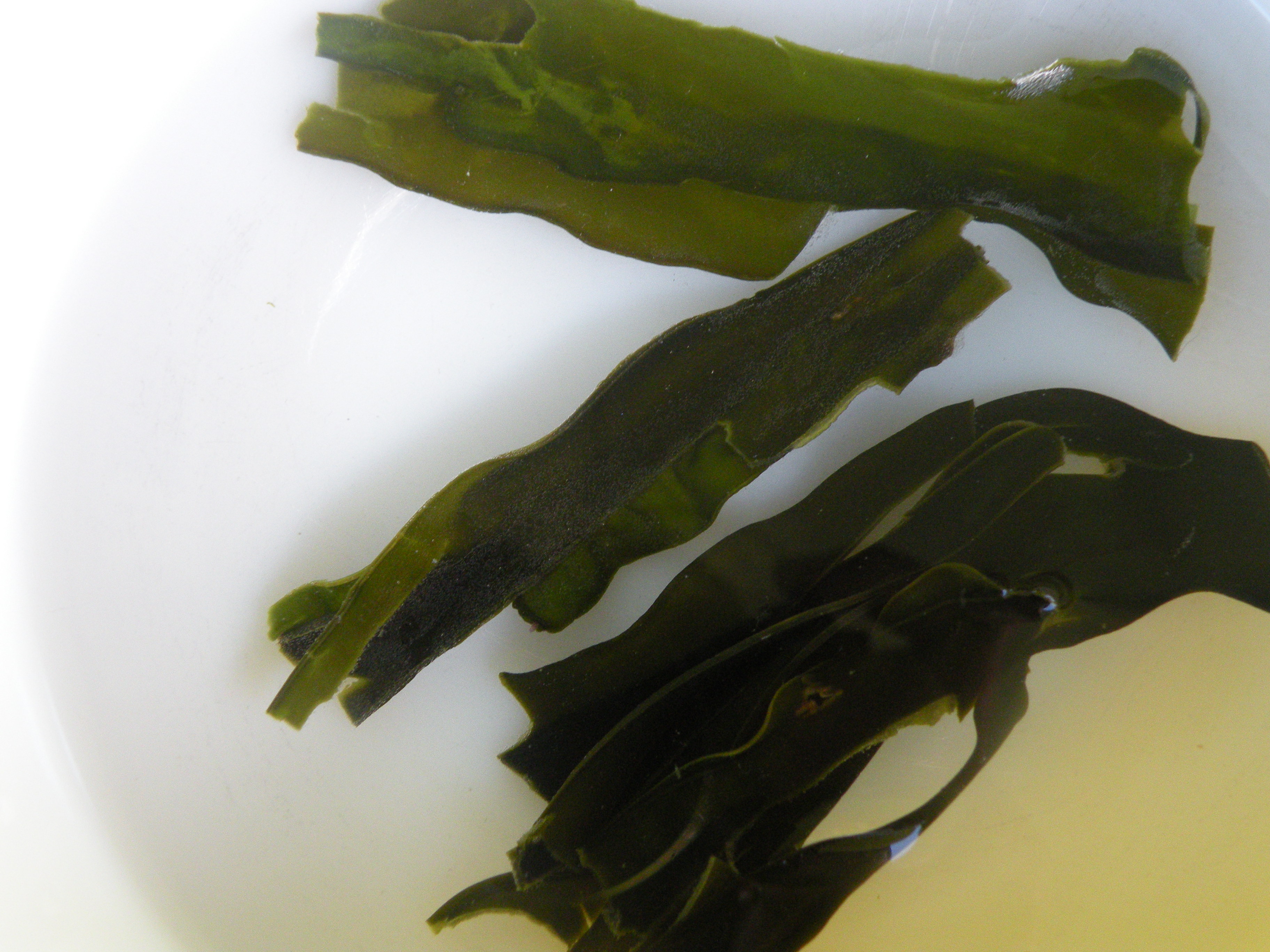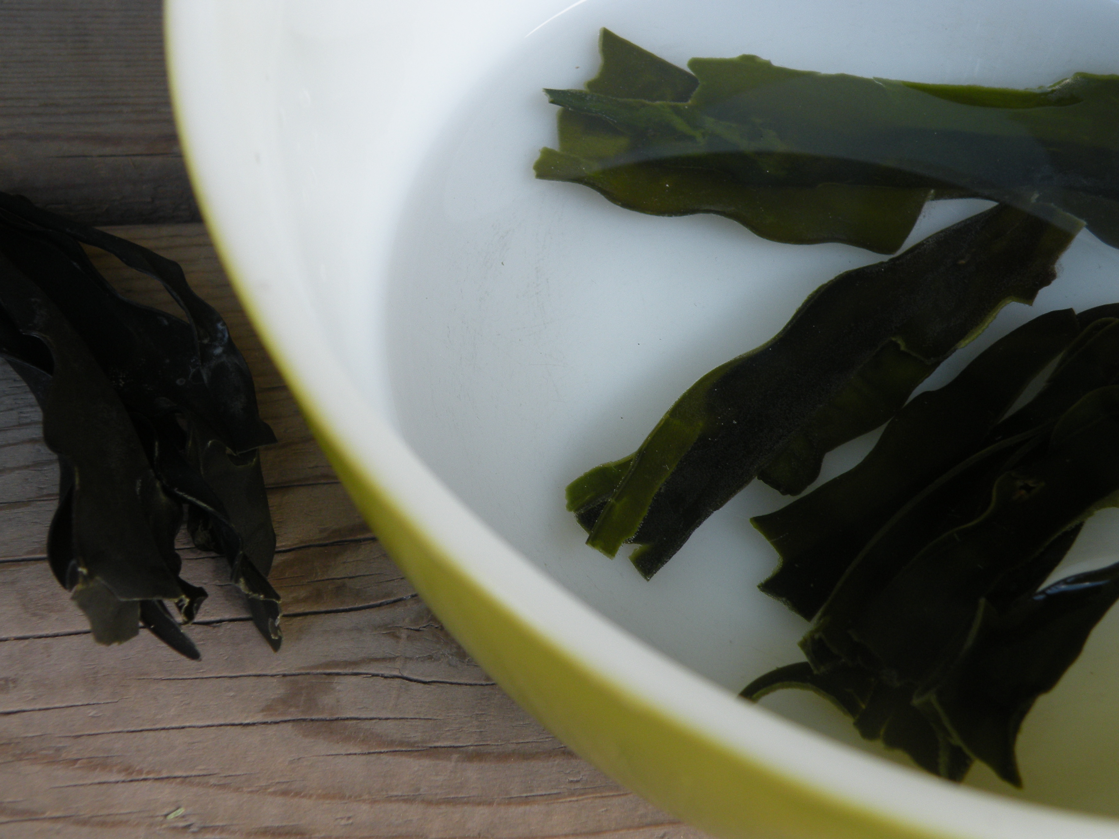 1.In a small pan, hydrate the wakame in water to cover for about 3 minutes, or until softened. Cut out the center stripe and discard. Return in the pan and bring water to a boil, lower heat and cook 7 minutes. Chop the wakame into 1- inch pieces and set aside.