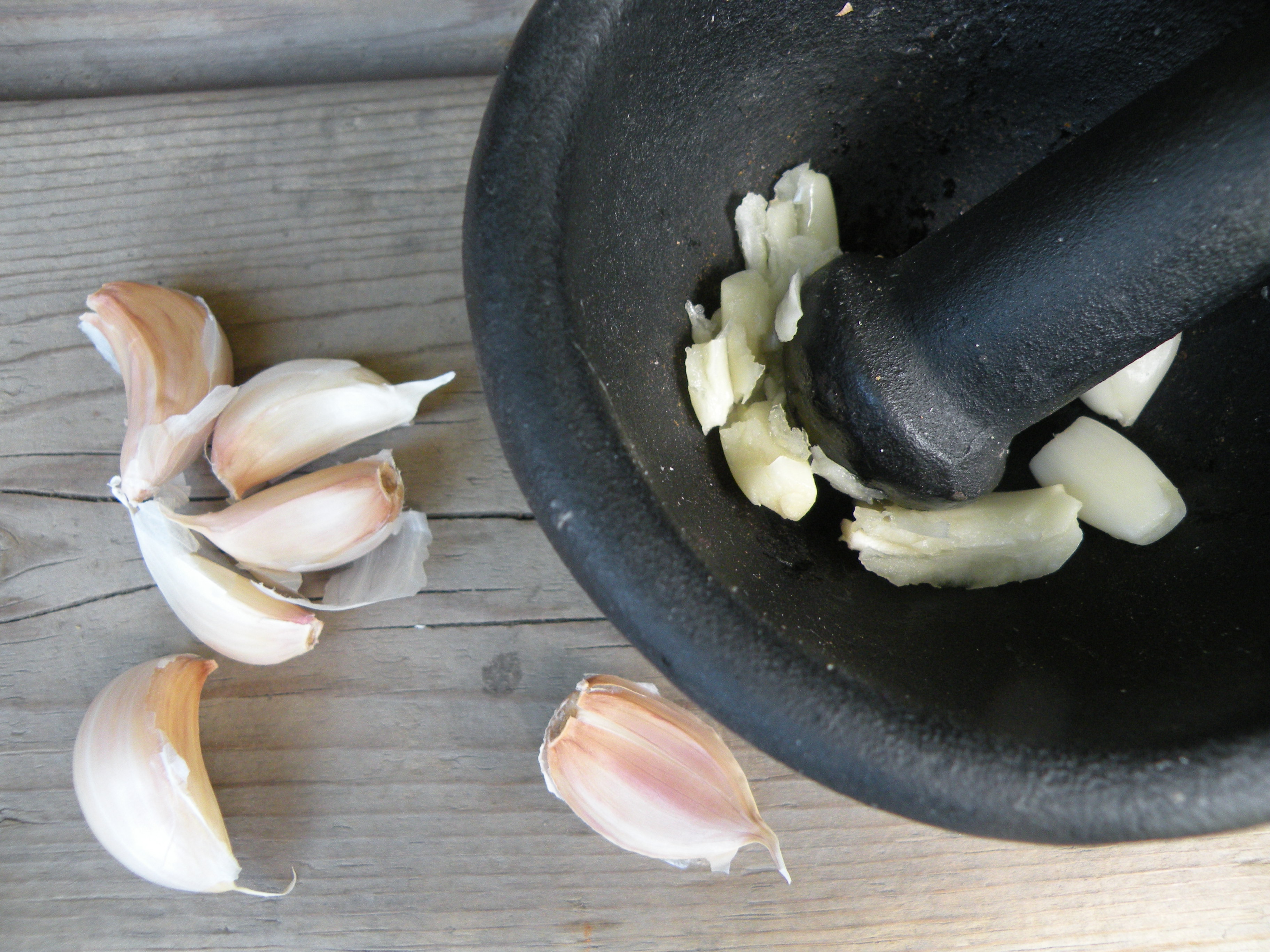 The intense, sublime sauce called aioli, a classic of Provençale cuisine, is the essence of simplicity and flavour. The garlic you use is crucial: it needs to be as fresh as possible. Look for solid heads with tight, papery skins. If the clove is too old, the garlic will be too strong. I recommend that you use a mortar and pestle but you can also use a blender; the consistency will be creamier and more like mayonnaise.